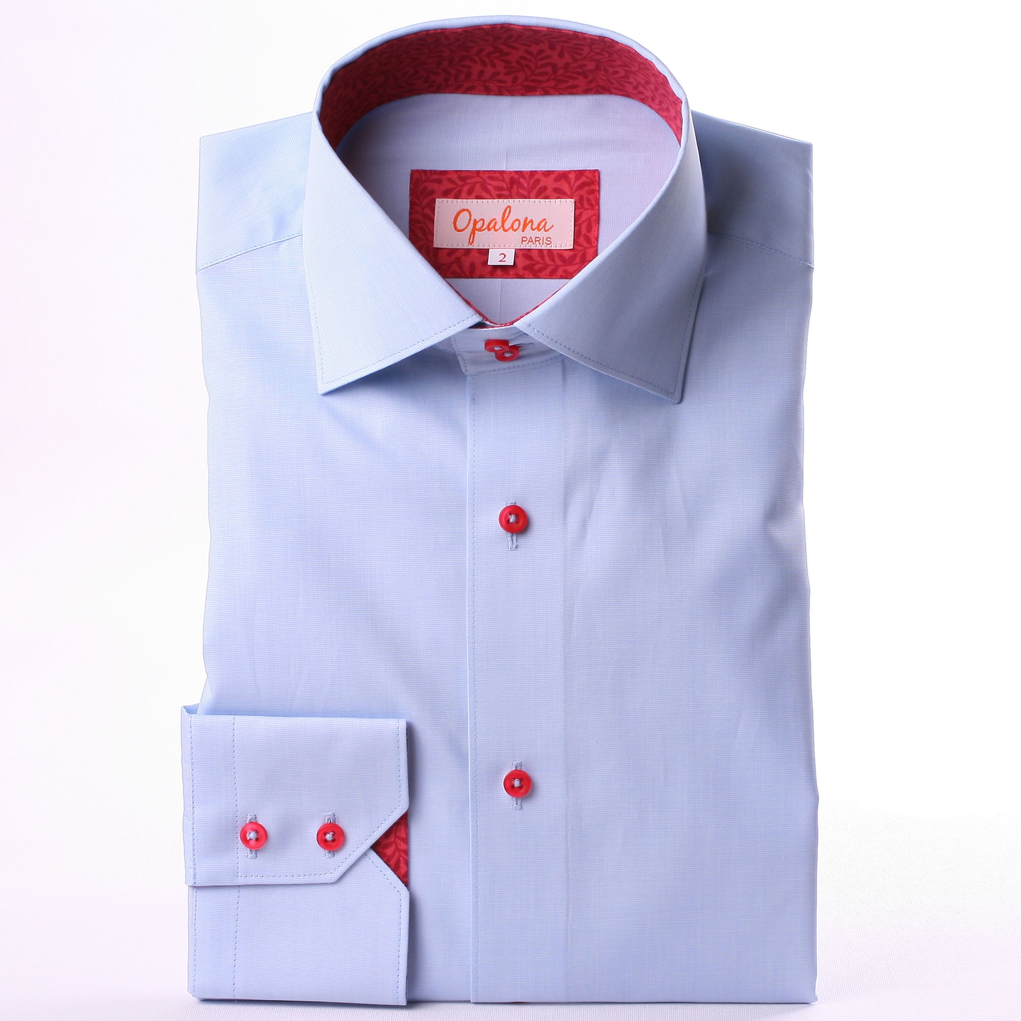 Blue slim fit shirt with red patterns collar and cuffs and red buttons